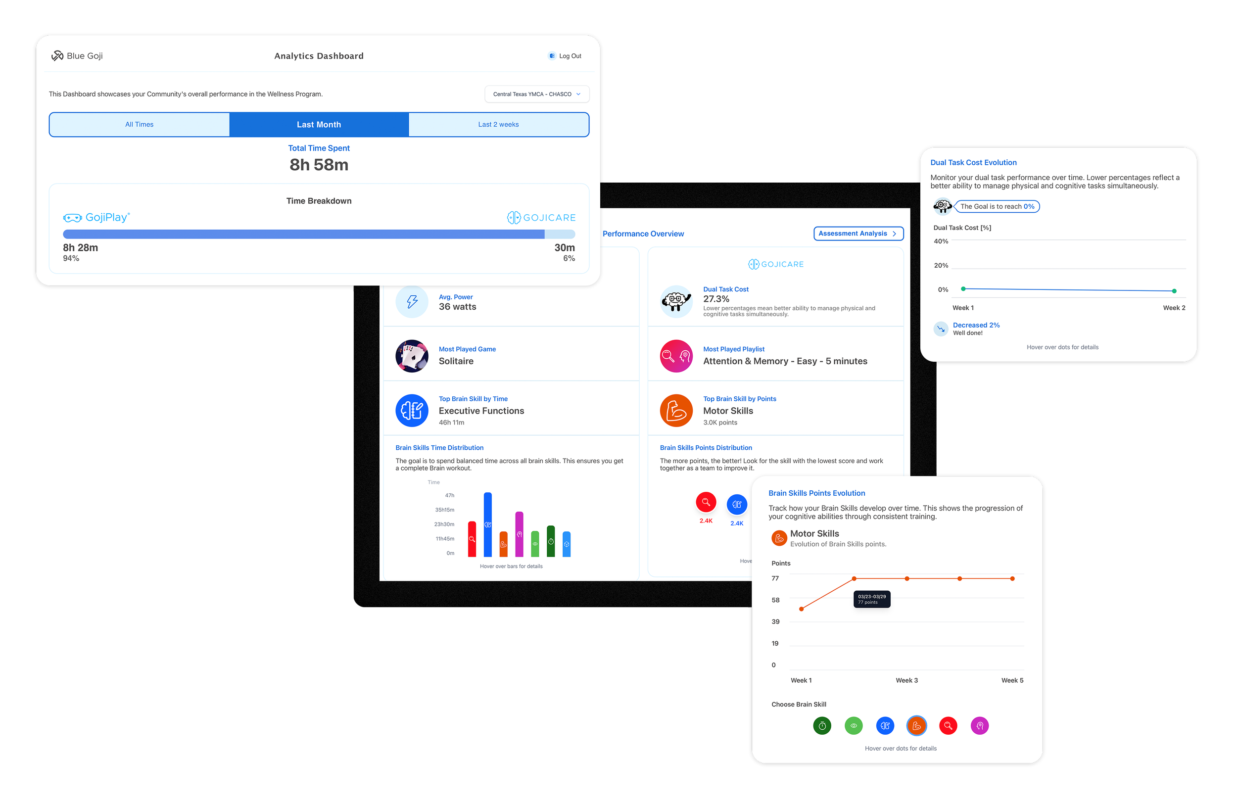 Using specially designed cardio games and advanced analytics, GojiCare® tracks both physical performance and cognitive activity/brain performance during each workout.