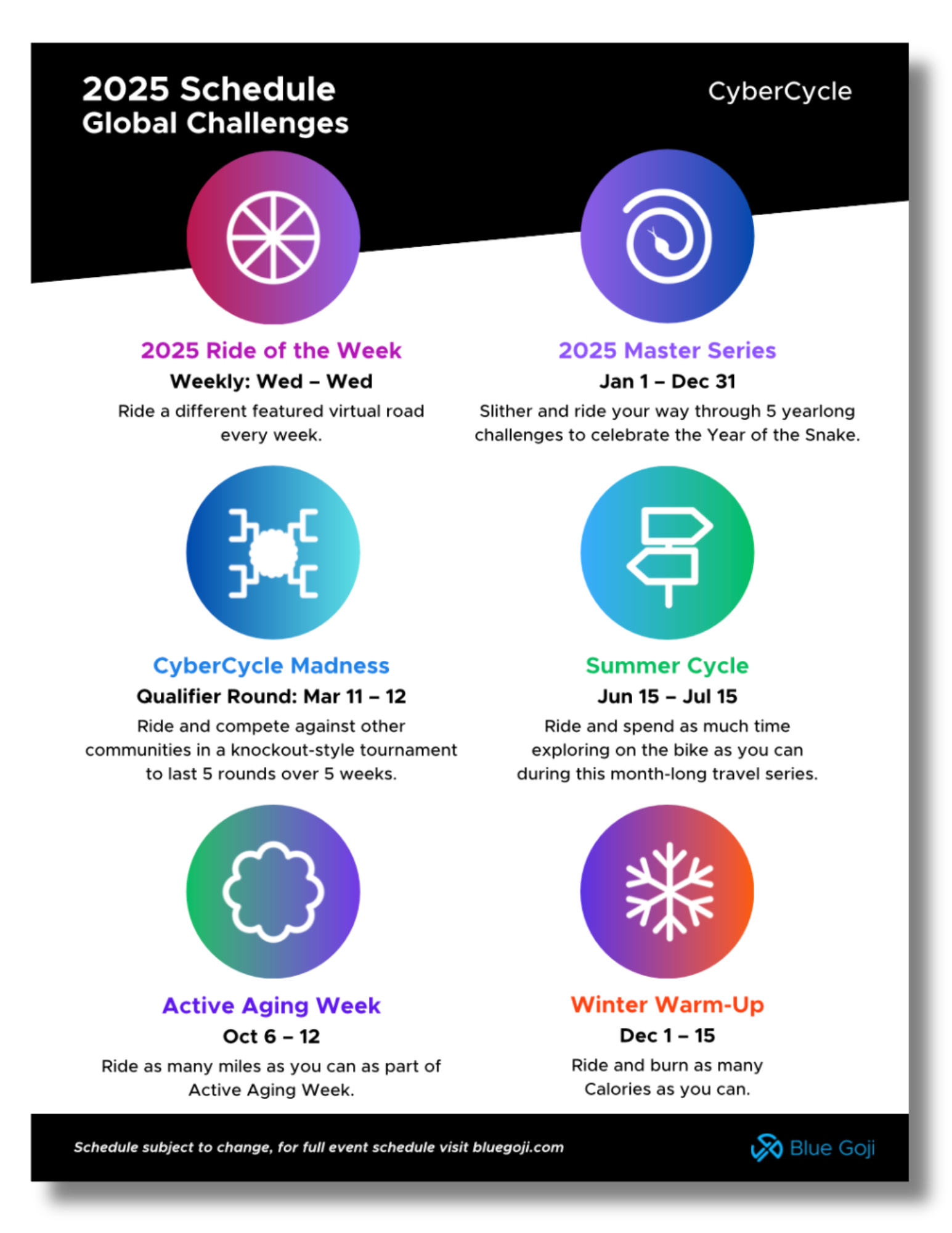 The 2025 Schedule and the Ride of the Week Calendar will keep you in the know for important, global challenges. (8.5×11)